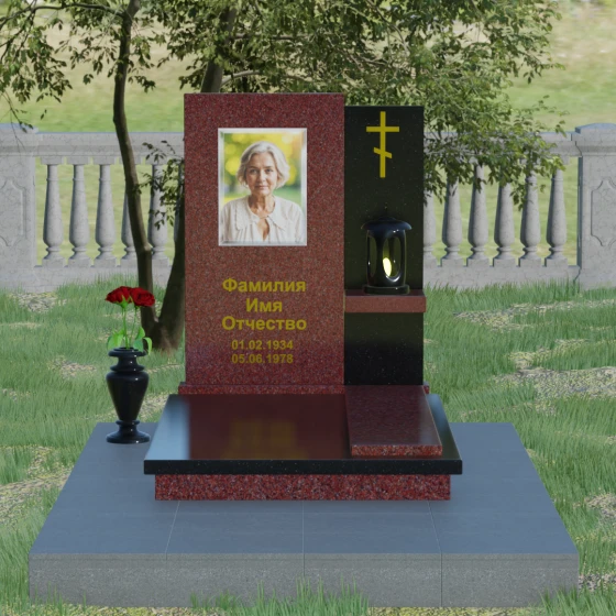Кому подойдет: Данная модель является универсальной благодаря своему лаконичному и одновременно глубокому дизайну. Она станет достойным выбором как для мужчины, так и для женщины. Строгость линий и золотые акценты подчеркнут статус и мужество, а плавные изгибы верхней грани привнесут нотки женственности и нежности. Этот мемориал выбирают те, кто хочет выразить глубокое уважение и создать на кладбище место, преисполненное достоинства и тишины, где каждый элемент — от лампады до фактуры камня — говорит о вечной любви.