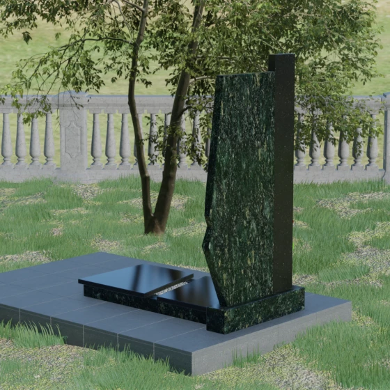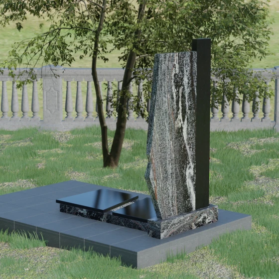 Данная мемориальная композиция — это торжество современной архитектурной мысли, воплощенное в благородном граните. Выбор этой модели обусловлен её уникальной асимметричной геометрией, которая выделяет захоронение на фоне типовых решений. Комбинированное исполнение из двух контрастных видов камня позволяет создать глубокий визуальный акцент: вертикальная колонна из насыщенного красного гранита символизирует духовную опору и жизненную энергию, в то время как основная стела из глубокого черного камня олицетворяет вечный покой и скорбь. Надгробие из натурального камня такой формы выглядит монументально и одновременно изящно благодаря сложной огранке. Правая грань основной стелы дополнена характерным скосом и ступенчатым вырезом, что придает изделию динамику и многогранность. Особое внимание уделено игре света и тени на полированных поверхностях: зеркальный блеск черного гранита отражает небо, создавая эффект глубины, а матовые фаски подчеркивают строгость и чистоту линий архитектурного ансамбля.