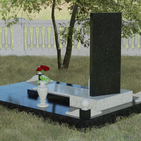 Особое внимание уделено благоустройству прилегающей территории. Стела установлена на массивный горизонтальный цоколь с глубокой зеркальной полировкой, которая визуально облегчает конструкцию, отражая небо и ландшафт. В состав комплекса входят декоративные элементы, завершающие облик: точеные каменные шары и изящная ваза, выполненные в едином стиле с основным изделием. Использование закрытой надгробной плиты или комбинированного цветника обеспечивает участку ухоженный и аккуратный вид на десятилетия, минимизируя необходимость сложного ухода за почвой.