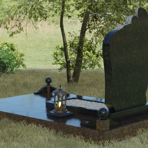 Благоустройство участка выполнено с учетом канонов высокой эстетики и практичности. Основной массив установлен на массивный гранитный цоколь, подчеркивающий надежность всей конструкции. Периметр участка очерчен строгим каменным бордюром, на углах которого возвышаются полированные шары — символы совершенства и завершенности жизненного цикла. Открытый цветник заменен на элегантную надгробную плиту с декоративной отсыпкой из светлой гальки, что не только создает законченный вид, но и значительно упрощает уход за местом памяти. Дополняют ансамбль изящная гранитная ваза для живых цветов и закрытая лампада, чей свет будет защищен камнем в любые непогоды.