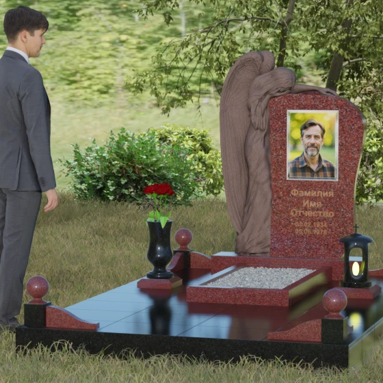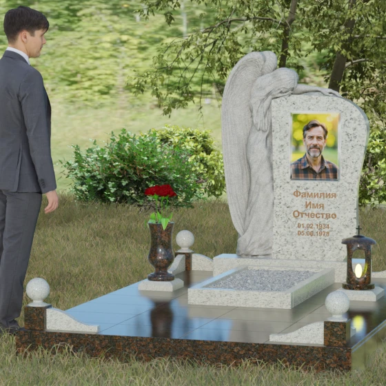 Форма этого надгробия лишена агрессивных острых углов в верхней части, что придает ему мягкость и одухотворенность. Асимметричная верхушка основного массива плавно огибает фигуру ангела, создавая ощущение защиты и покровительства. С точки зрения символизма, ангел здесь выступает не только как страж души, но и как медиатор между мирами, разделяющий горечь утраты с живыми. Каменные шары на столбиках ограждения отсылают к вечности и бесконечности бытия. Массивность основания и использование цельных плит для мощения участка олицетворяют устойчивость памяти, которую не в силах разрушить ни ветры, ни дожди.