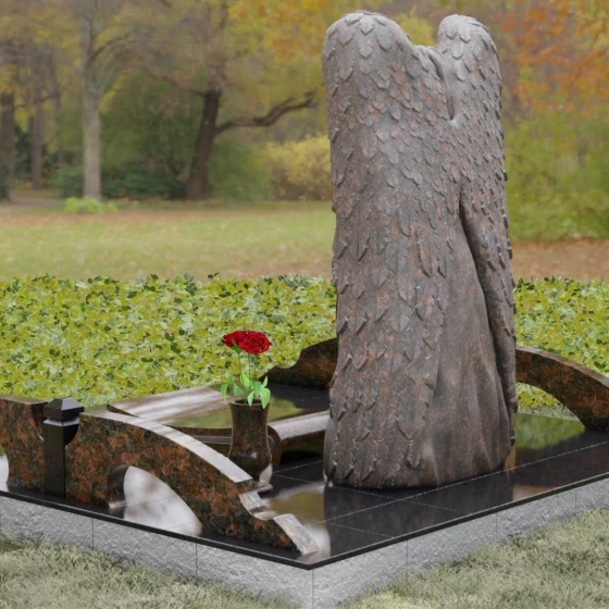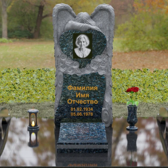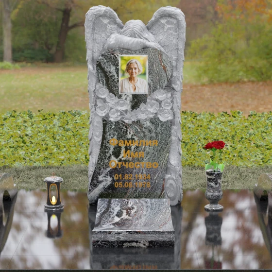Данная мемориальная композиция представляет собой истинное произведение ритуального искусства, где каждый элемент пропитан глубоким символизмом и благородством. Центральным художественным образом выступает величественная фигура скорбящего ангела, чьи массивные крылья бережно, словно в последней попытке защитить, обрамляют стелу в форме сердца. Мастерство камнереза здесь проявляется в искусной игре контрастов: матовая, детально проработанная фактура оперения крыльев и драпировок одежды небесного покровителя противопоставлена зеркально отполированной глади черного гранита. Именно на этой поверхности, лишенной малейших изъянов, свет преломляется наиболее эффектно, создавая ощущение глубины и монументальности.