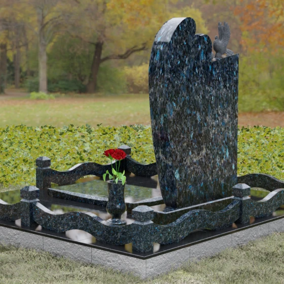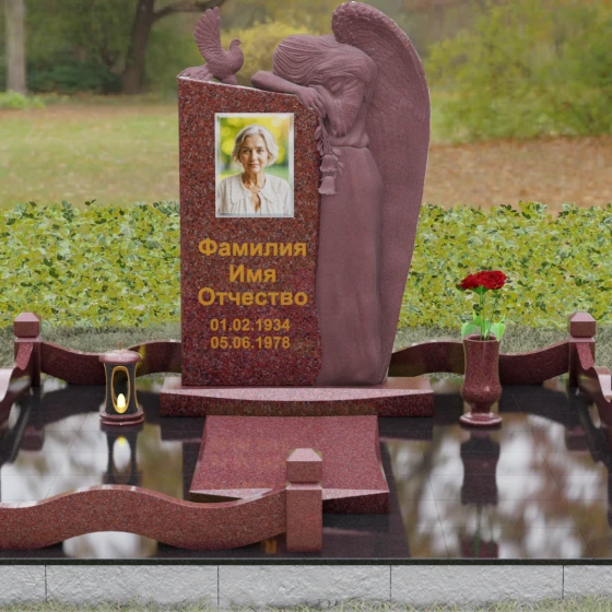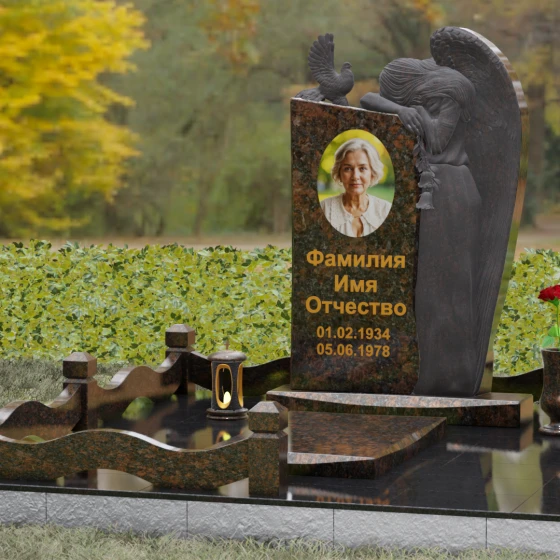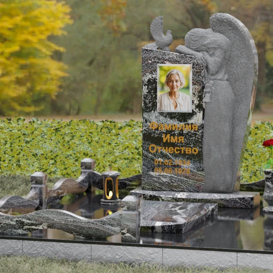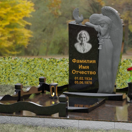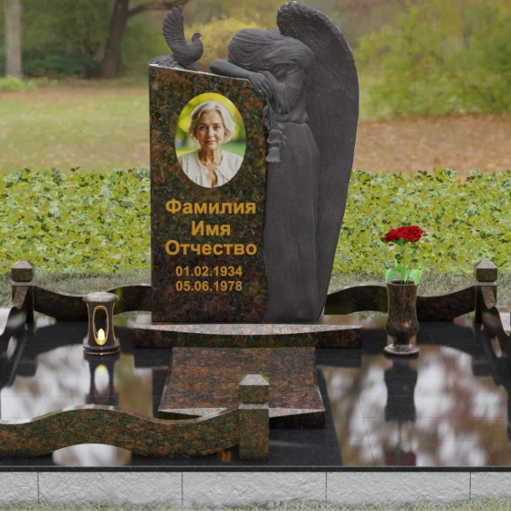 Представленный мемориальный ансамбль (Артикул 129) — это не просто памятный знак, а глубокое архитектурное высказывание, в котором застывшая в камне скорбь обретает форму высокого искусства. Величественная стела доминирует в композиции, представляя собой сложный симбиоз строгой геометрии и филигранной художественной резьбы. Центральным элементом является объемная фигура скорбящего ангела, выполненная в технике глубокого барельефа. Мастерски переданная пластика крыльев с детальной проработкой каждого перышка создает ощущение мягкости, которая парадоксальным образом контрастирует с твердостью натурального камня. Склоненный лик ангела и тонкие складки его одеяний, выполненные в матовом срезе, эффектно выделяются на фоне зеркально полированной поверхности основной плиты. В руках небесного покровителя застыла роза — символ вечной любви, чьи лепестки проработаны с исключительным вниманием к объему и естественности линий.