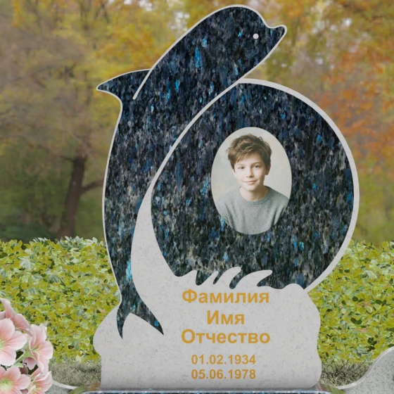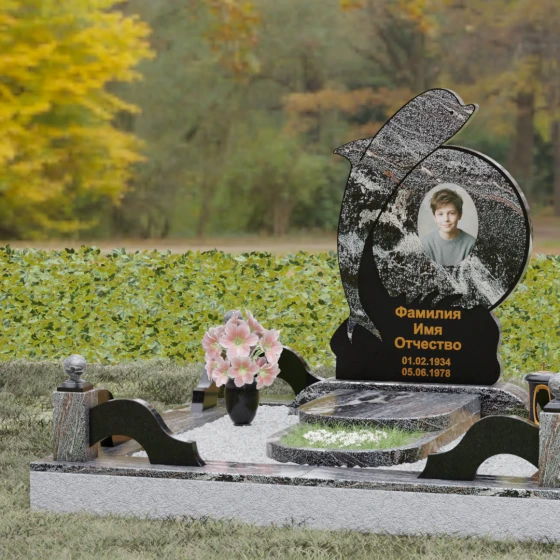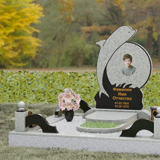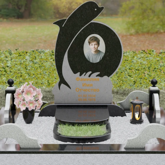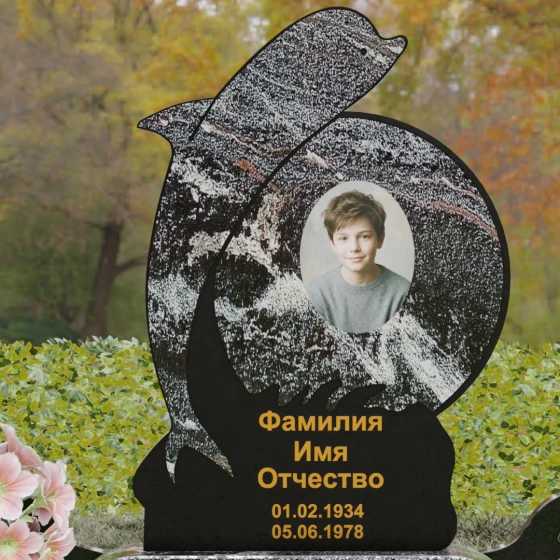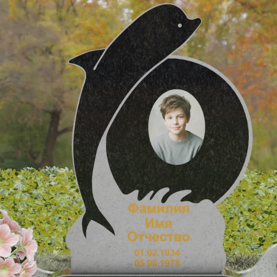 Этот гранитный монумент представляет собой не просто мемориальный знак, а настоящую художественную композицию, преисполненную глубокого символизма. Центральное место в дизайне занимает фигура дельфина — древнего символа спасения, чистоты и проводника душ в лучший мир. Плавный, динамичный изгиб морского обитателя словно обнимает центральный медальон, создавая защищенное, камерное пространство для портрета близкого человека. Мастера добились удивительной игры контрастов: зеркально отполированное туловище дельфина эффектно выделяется на фоне матовой, детально проработанной резьбы в основании, имитирующей морскую пену и гребни волн.