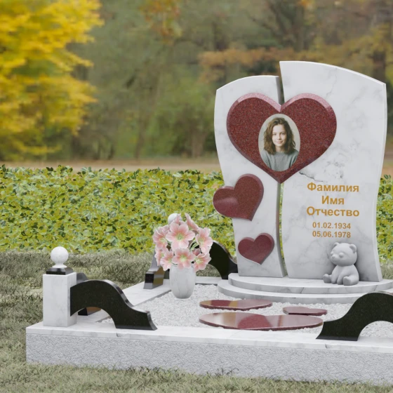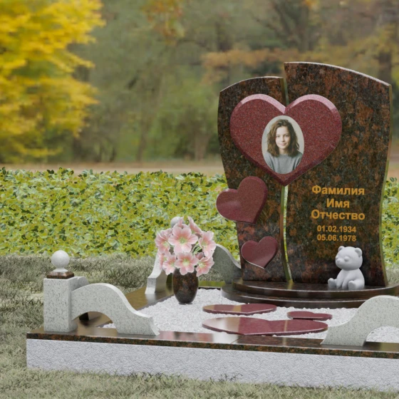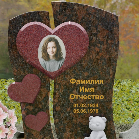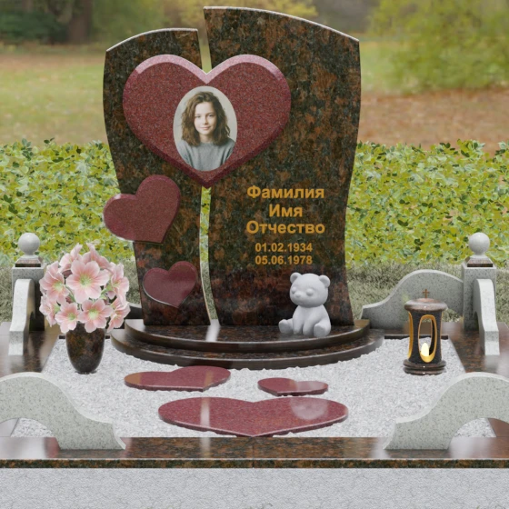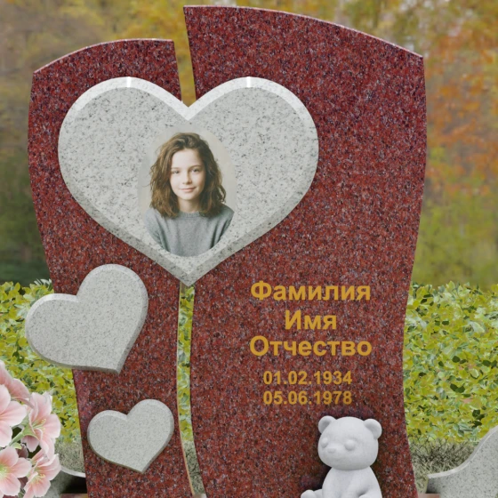 Оформление: Уникальная геометрия этого надгробия сама подсказывает идеальное расположение гравировки. Крупное центральное сердце словно создано для размещения портрета — здесь он будет главным смысловым акцентом, защищенным символом любви. Правую, более широкую часть плиты, рекомендуется использовать для нанесения Фамилии, Имени, Отчества и дат жизни. Здесь же останется достаточно места для проникновенной эпитафии или дополнительного декоративного элемента, например, небольшой виньетки или креста.