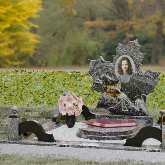 Завершенность ансамблю придают декоративные элементы: изящные каменные шары на столбиках ограждения, символизирующие целостность и бесконечность, а также точеная гранитная ваза, установленная у подножия. Ваза позволяет всегда держать живые цветы в достойном обрамлении. Каждый элемент этого комплекса — от резного листа до полированного цоколя — работает на создание единого пространства скорби и любви.