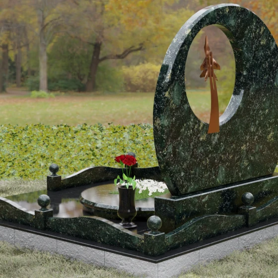 Выбор мемориальной композиции — это всегда поиск баланса между земной скорбью и небесным триумфом человеческого духа. Данная величественная стела, выполненная в уникальной геометрии круга с асимметричным сквозным вырезом, представляет собой не просто памятный знак, а глубокое философское высказывание. Символизм окружности отсылает нас к идее бесконечности, небесного свода и завершенности жизненного пути. Внутреннее пространство стелы акцентировано филигранной металлической фигурой взмывающего ввысь истребителя. Этот элемент несет в себе мощный эмоциональный заряд: он олицетворяет прорыв сквозь земные преграды, вечный полет и верность призванию, которое сильнее самой смерти.