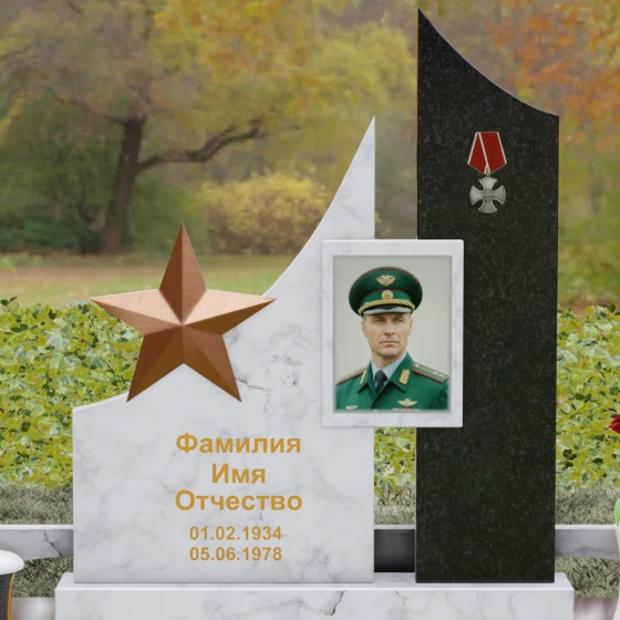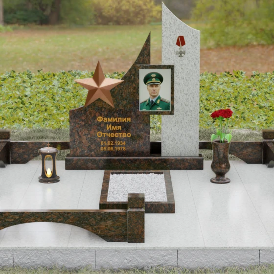 В основе художественной концепции лежит динамичная асимметрия, которая придает всей структуре современный, «европейский» облик. Центральная стела состоит из двух контрастных блоков, объединенных общим основанием. Левая часть, выполненная из темного полированного камня, имеет резкий диагональный срез, направленный вверх. На ее вершине закреплена объемная пятиконечная звезда с эффектом бронзового напыления — мощный акцент, подчеркивающий статус и заслуги покойного. Правая часть композиции представляет собой высокий вертикальный пилон из фактурного коричнево-красного гранита, на верхнем сегменте которого расположена детальная реплика ордена Мужества.