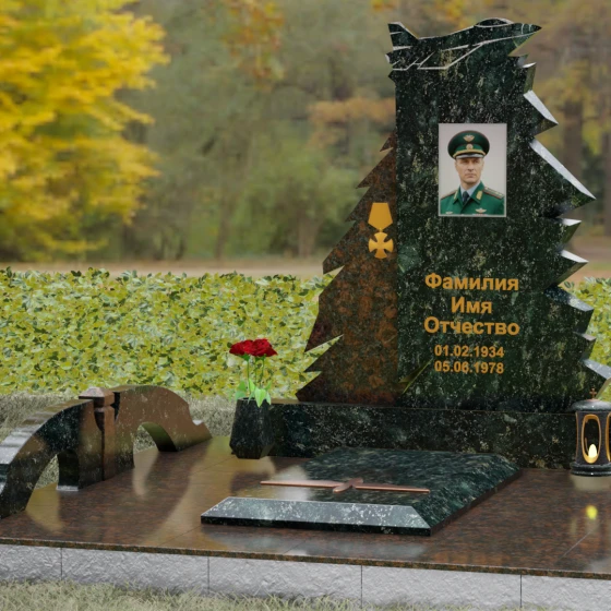 Надгробие из натурального камня (Артикул 202) — это монументальная композиция, созданная для того, чтобы увековечить память о человеке чести, чья жизнь была неразрывно связана с небом и служением отечеству. Архитектурное решение стелы поражает своей динамикой и символизмом: в верхней части монумента застыл в стремительном взлете силуэт современного истребителя, выполненный с ювелирной точностью. Левая грань памятника решена в виде резных, асимметричных выступов, напоминающих ветви северной ели или ломаные линии скалистого утеса. Такая геометрия придает мемориалу мужественный, волевой характер, подчеркивая стойкость и твердость духа ушедшего. Игра ломаных линий и острых углов создает ощущение мощи, которое невозможно передать в классических прямоугольных формах.