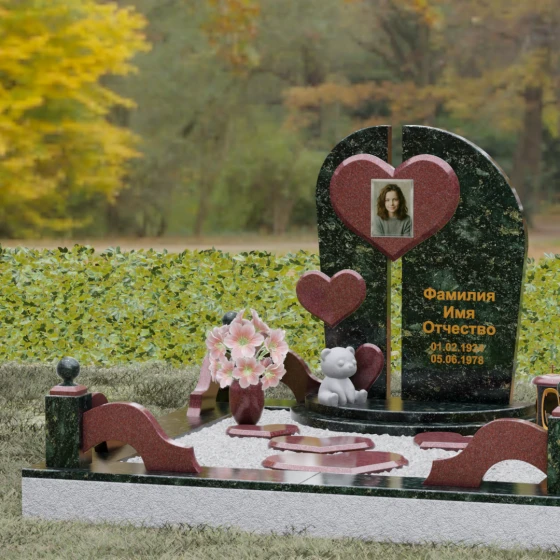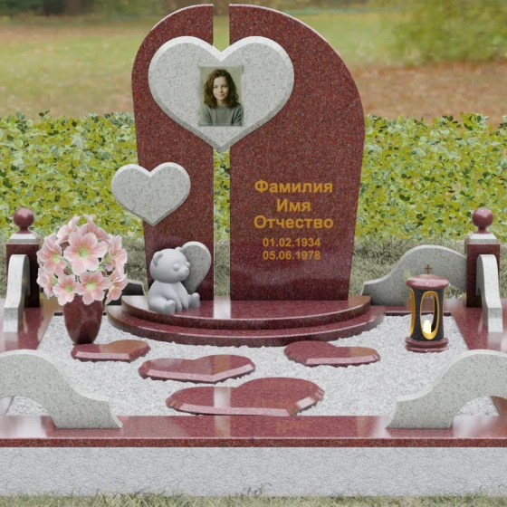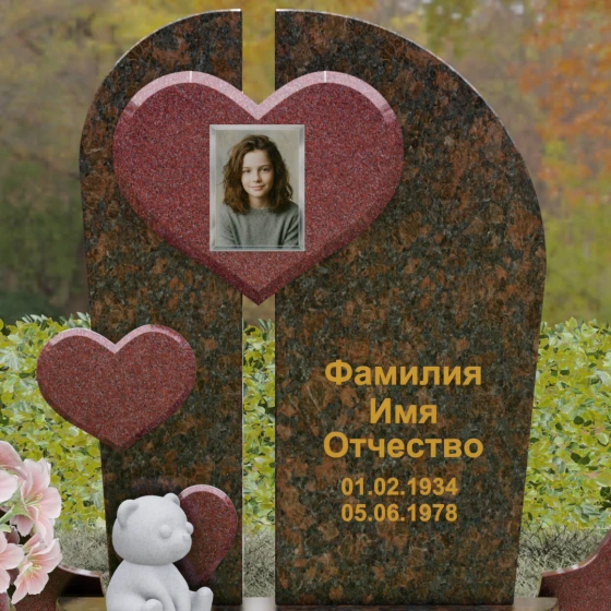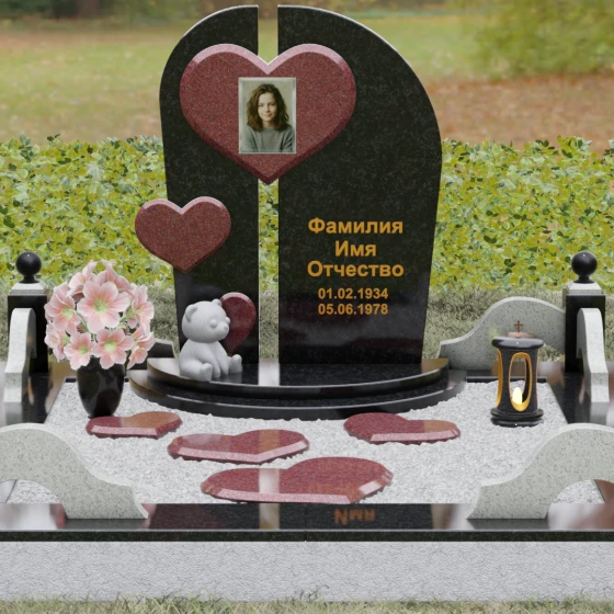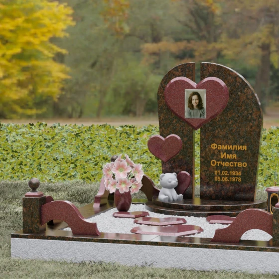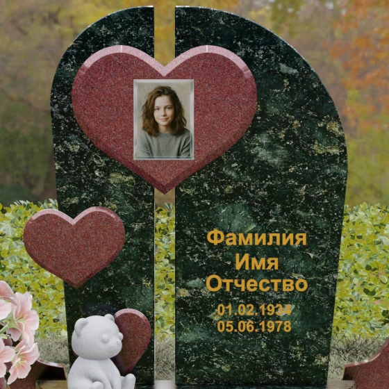Визуальная концепция модели строится на гармоничном сочетании двух асимметричных вертикальных стел, выполненных из темного камня с безупречной зеркальной полировкой. Центральным элементом композиции является объемное сердце из контрастного красного гранита, которое словно объединяет две половины памятника. В его центре располагается портрет, обрамленный тонкой фаской, что создает эффект драгоценного медальона. Дополнительный акцент вносит второе, меньшее по размеру сердце, закрепленное на левой части стелы, что добавляет динамики и многослойности художественному образу.
