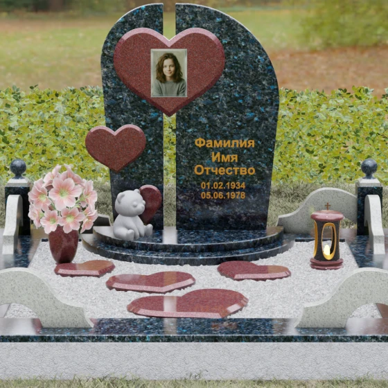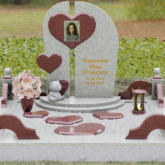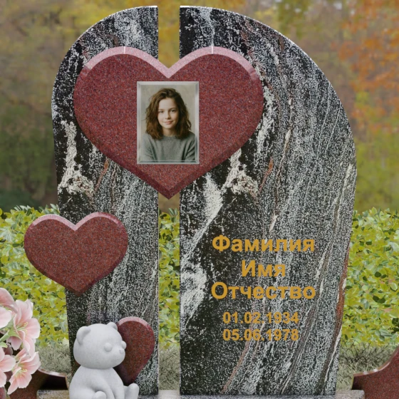 Каждая линия этой модели наполнена глубоким смыслом. Разделенная на две части стела символизирует границу между двумя мирами, а объединяющее их сердце — торжество любви над временем и забвением. Фигура медвежонка у подножия — символ чистоты, беззащитности и невинной души, что часто выбирают для оформления захоронений самых дорогих и рано ушедших близких. Использование контрастных цветов камня подчеркивает многогранность человеческой жизни, где есть место и глубокой скорби, и светлым воспоминаниям. Этот памятник не просто обозначает место покоя, он рассказывает историю глубокой привязанности, которая не исчезает с годами.
