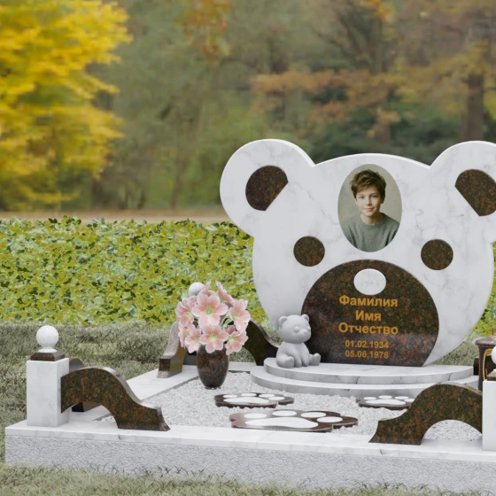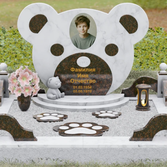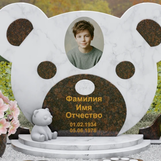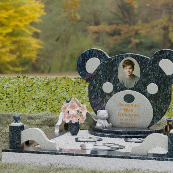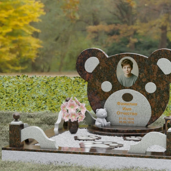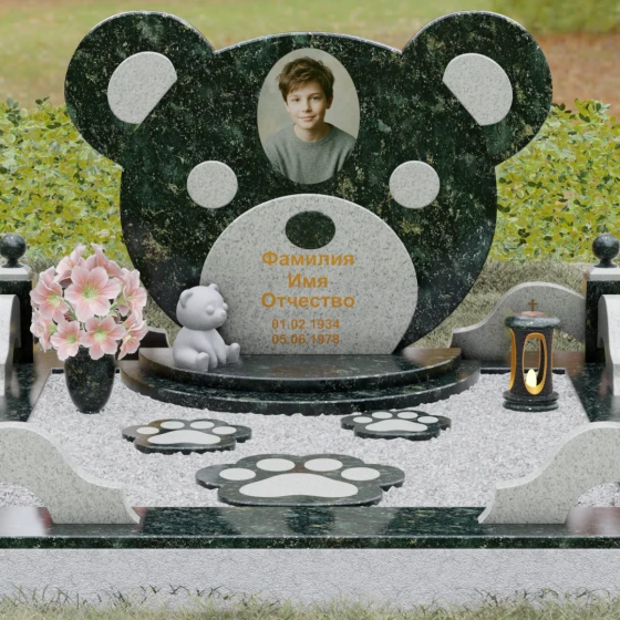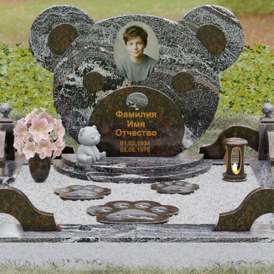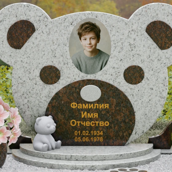 Эта мемориальная композиция представляет собой уникальный художественный проект, созданный для того, чтобы выразить бесконечную нежность и светлую печаль. Главная стела выполнена в форме головы медвежонка — символа чистоты, детства и вечного сна. Плавные, округлые линии силуэта лишены острых углов, что придает изделию визуальную мягкость и умиротворение. Мастера-камнерезы виртуозно передали геометрию образа: симметричные ушки со светлыми вставками и выразительные круглые глаза, созданные методом инкрустации камня другого оттенка. Игра контрастов между глубоким темным основанием и светлым матовым срезом декоративных элементов создает эффект живого объема, заставляя свет играть на полированных гранях и подчеркивая безупречную пластику камня.