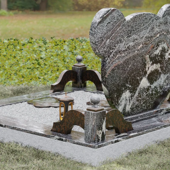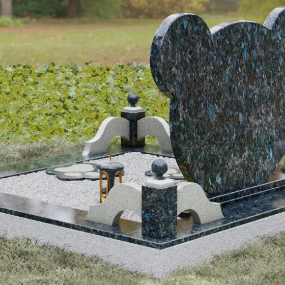 Завершают облик ансамбля функциональные и декоративные элементы: изящная гранитная ваза с плавными изгибами и закрытая каменная лампада, внутри которой мягко мерцает свет. Каждый элемент этой мемориальной композиции, от филигранно выточенных «ушек» до зеркально отполированной надгробной плиты, свидетельствует о глубоком уважении к памяти ушедшего. Это исполненное любви и профессионализма воплощение вечности в камне, которое станет достойным символом памяти, согревающим сердце своей теплотой и совершенством форм.