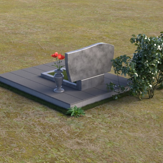 Форма стелы отличается лаконичностью, но при этом не лишена изысканности. Верхняя часть имеет мягкий, волнообразный изгиб, словно склоняясь в знак уважения и скорби. Прямоугольная подставка под стелой, выполненная в том же полированном граните, добавляет композиции завершенность и устойчивость. Дополнительная горизонтальная плита, расположенная на основании, создает пространство для возложения цветов и памятных вещей, позволяя выразить свою любовь и уважение.
