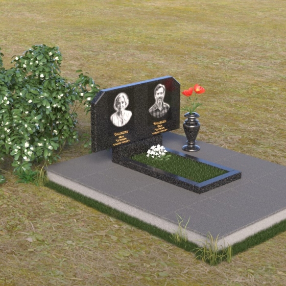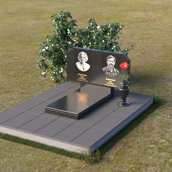 Форма стелы этого памятника предоставляет широкие возможности для оформления. Помимо портретов, на ней можно разместить эпитафии, религиозные символы или другие памятные надписи. Расположение портретов может быть как горизонтальным, как показано на изображении, так и вертикальным, в зависимости от ваших пожеланий. Важно помнить о гармоничном соотношении размеров портретов и остального текста, чтобы создать сбалансированную композицию. Гранитная подставка обеспечивает устойчивость всей конструкции и может быть дополнена цветником или другими элементами благоустройства. Черный цвет камня идеально сочетается с любыми оттенками цветов, поэтому вы можете смело экспериментировать с оформлением, создавая уникальный и запоминающийся образ. Ваза, входящая в комплект, предназначена для размещения живых или искусственных цветов. Она выполнена в строгом стиле и гармонично дополняет общую композицию памятника.