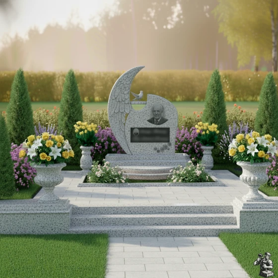 Дизайн этого гранитного монумента глубоко символичен. Форма, напоминающая ангельское крыло, олицетворяет покой, защиту и вечное упокоение души под сенью небесной благодати. Голубь, расположенный на вершине, традиционно ассоциируется с миром, надеждой и чистотой души, что делает эту композицию особенно проникновенной. Общая пластика форм, с ее плавными изгибами и мягкими линиями, создает ощущение умиротворения и безмятежности. Этот мемориал становится не просто обозначением места захоронения, а настоящим произведением искусства, выражающим глубокую любовь, уважение и стремление сохранить светлую память о человеке на долгие века.