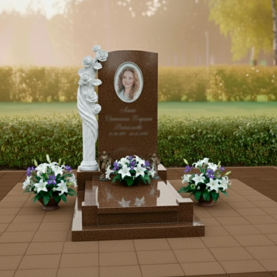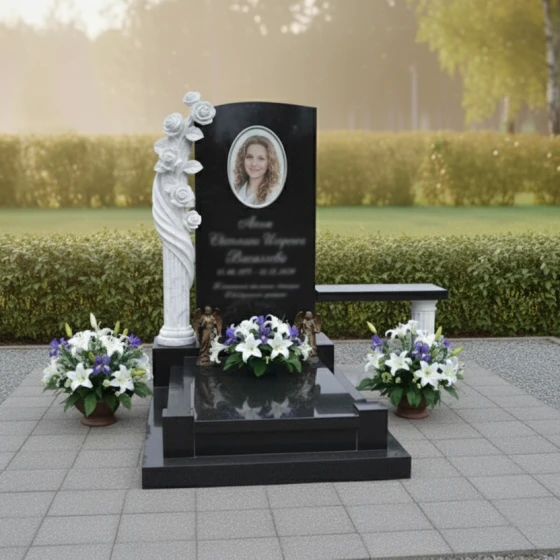 Центральный элемент композиции — строгая, но при этом изысканная стела, выполненная в форме элегантной арки с мягким, округлым верхом. Ее грани тщательно отполированы до зеркального блеска, создавая глубокий черный фон, который идеально контрастирует с нежностью и чистотой резных элементов. Слева от стелы возвышается потрясающая скульптура, изображающая пышную ветвь роз. Каждая роза, от бутона до полностью раскрывшегося цветка, вырезана с удивительной детализацией: видны тонкие лепестки, их изящные изгибы и нежная фактура. Белый цвет камня, из которого выполнена скульптура, подчеркивает ее воздушность и чистоту, создавая пронзительный контраст с темным гранитом стелы. Этот контраст между глубокой полировкой и матовой, светлой фактурой резных элементов придает монументу особую выразительность и объемность, символизируя переход от земного к вечному, от скорби к светлой памяти.