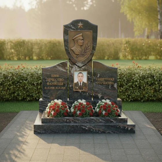 Центральное место в композиции занимает верхняя часть стелы, выполненная в форме геральдического щита, увенчанного пятиконечной звездой — символом воинской доблести и славы. На щите расположен объемный бронзовый барельеф, изображающий профиль мужчины в военной форме, окруженный лавровой ветвью — традиционным знаком победы и мира. Этот элемент придает монументу особую торжественность и подчеркивает героический характер личности. Под щитом, на основной части стелы, расположена глубокая ниша, предназначенная для портрета, который словно вписан в камень, становясь его неотъемлемой частью. Текст «ИМЯ ОТЧЕСТВО ФАМИЛИЯ» и даты жизни выполнены четким, строгим шрифтом, а справа расположена надпись «ЗАЩИТНИКУ ОТЕЧЕСТВА», выгравированная с особым почтением. Контраст между идеально отполированной черной поверхностью камня и матовыми, глубоко выгравированными элементами создает динамичное визуальное восприятие, подчеркивая значимость каждой детали.