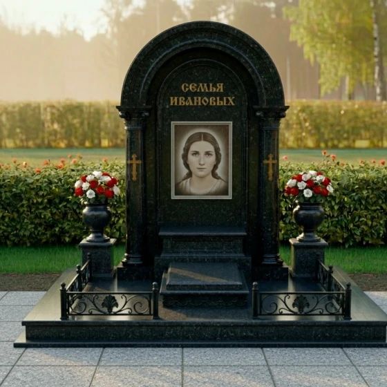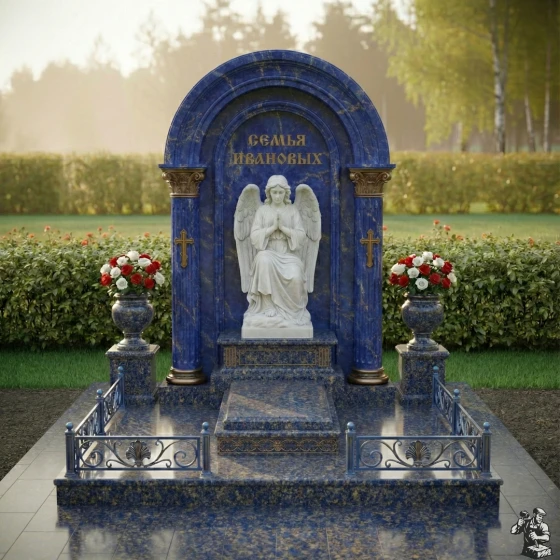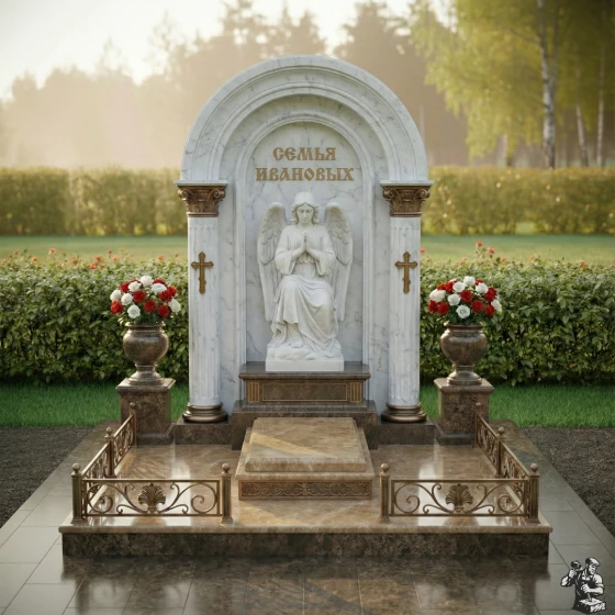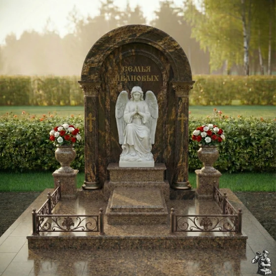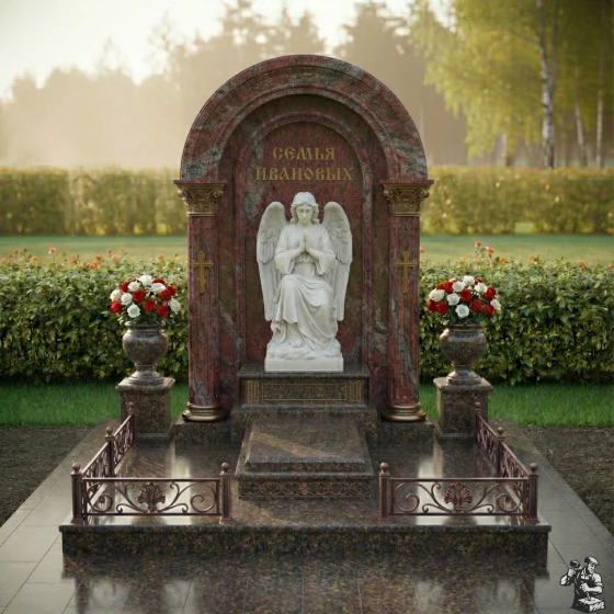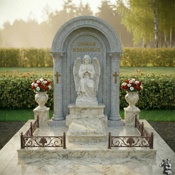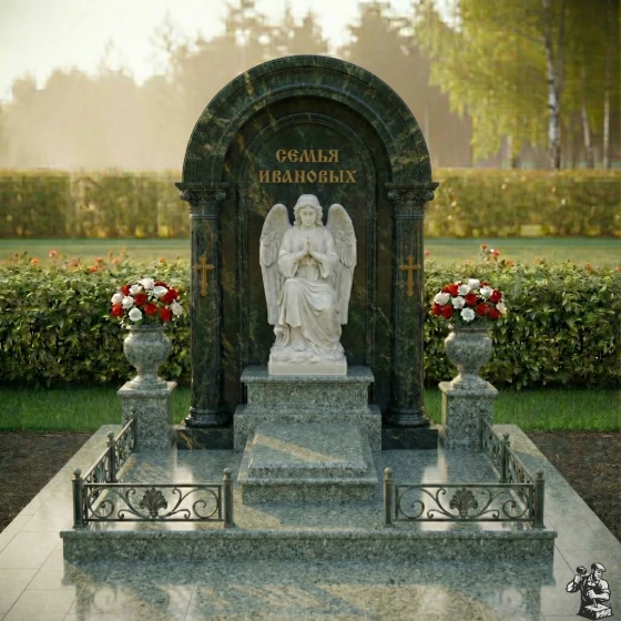 Центральное место занимает изящная скульптура ангела, выполненная из светлого камня, что создает сильный визуальный акцент на фоне темной полированной стелы. Ангел, сидящий в позе глубокого размышления, с руками, сложенными в молитве, и опущенной головой, излучает умиротворение и скорбь. Его детализированные крылья и складки одеяний придают фигуре реалистичность и объем. Резьба по камню на ангеле выполнена с исключительным мастерством, передавая мягкость и нежность образа. По бокам от скульптуры, на внутренних колоннах арки, расположены лаконичные православные кресты, также выполненные в контрастном светлом цвете, что добавляет композиции духовную глубину без излишней пышности. Над ангелом, в верхней части арки, выгравирована надпись "СЕМЬЯ ИВАНОВЫХ", выполненная золотыми буквами, что придает ей торжественность и значимость.
