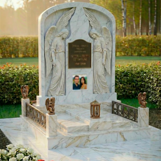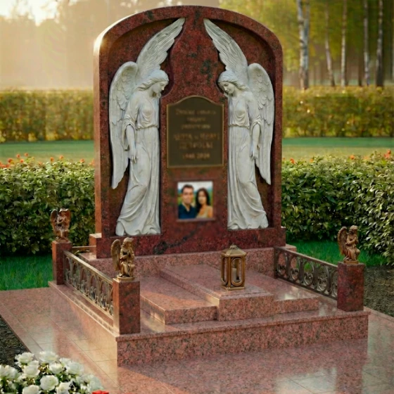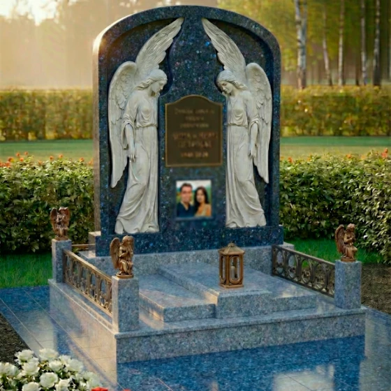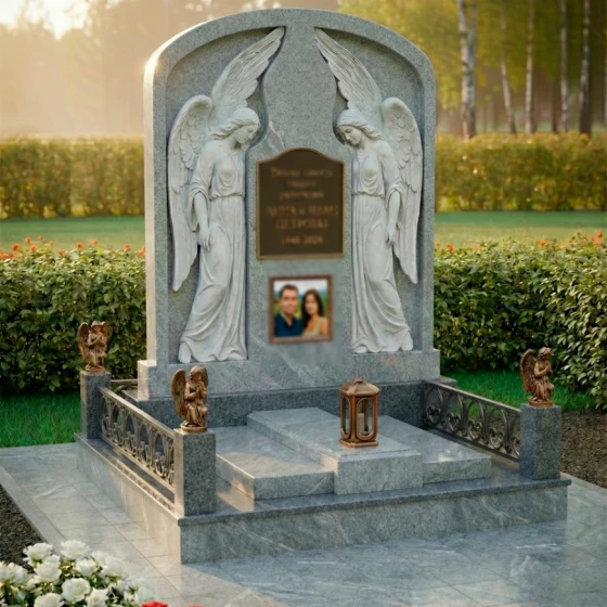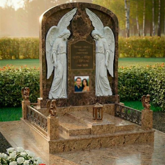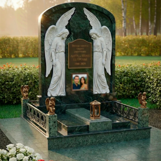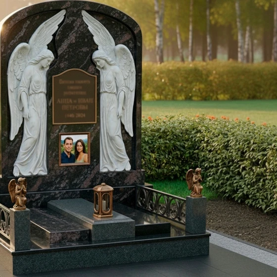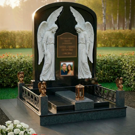 Особое внимание привлекают детали резьбы, выполненные с необычайной тонкостью и мастерством. По обе стороны от центральной плиты, предназначенной для эпитафии и портрета, возвышаются две фигуры ангелов. Их крылья распахнуты, словно оберегая покой ушедших, а склоненные головы выражают глубокую скорбь и молитву. Скульптурная проработка ангелов поражает своей реалистичностью: видны мельчайшие складки одеяний, мягкие линии рук и нежные черты лиц. Игра контрастов между зеркальной полировкой черного камня и светлым, матовым срезом резьбы придает композиции объем и выразительность, подчеркивая каждый изгиб и каждую деталь.
