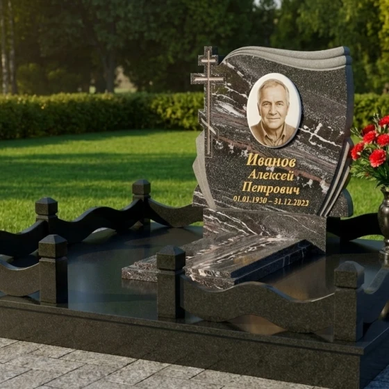 Мемориальная композиция Артикул: ПН 480 представляет собой гармоничное сочетание классической строгости и плавных, утонченных линий, создающих ощущение покоя и вечного достоинства. Центральная стела, выполненная в глубоком черном цвете, обладает выразительной асимметричной формой. Левая грань стелы образует мягкую, ниспадающую волну, которая словно обнимает собой вертикальный элемент — изящный православный крест. Этот крест, выполненный в лаконичном стиле без распятия, подчеркивает духовную составляющую композиции, его грани тщательно обработаны, создавая игру света и тени. Правая сторона стелы завершается более округлым, но не менее элегантным изгибом, напоминающим развернутый свиток или волну, что придает всему изделию динамичность, сохраняя при этом общую умиротворенность.