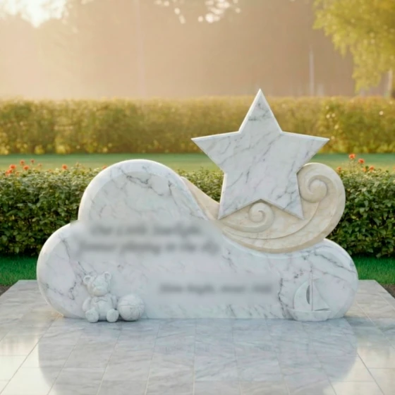 Особое внимание привлекает игра контрастов, мастерски воплощенная в этом монументе. Основная часть, выполненная из глубокого черного гранита, отполирована до зеркального сияния, в котором отражается свет и надежда. На этом фоне выделяется изящный элемент в виде стилизованной звезды, выполненный из светлого мрамора с его неповторимыми прожилками. Звезда, как символ путеводного света и вечной души, поднимается над облаком, указывая на небесный путь. Ее матовая, нежная поверхность создает гармоничный контраст с блестящим черным гранитом, подчеркивая тонкую работу мастера. Вокруг звезды, словно легкий вихрь или нежные волны, вырезаны спиралевидные элементы из того же светлого камня, добавляя композиции динамики и воздушности. В нижней части монумента, на его основании, расположены трогательные резные фигурки: милый плюшевый медвежонок с мячом и изящная лодочка. Эти элементы, выполненные из светлого камня, символизируют невинность детства, мечты и путешествие души, создавая глубоко личный и трогательный образ. Их мягкие, сглаженные формы идеально вписываются в общую концепцию плавности и нежности.