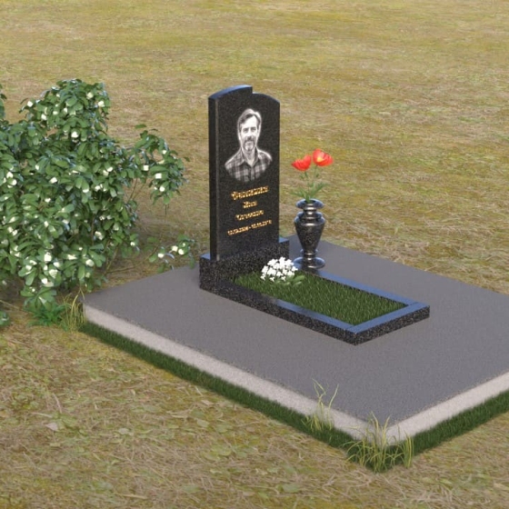Величественная стела ПВ 013 – это монумент, в котором гармонично сочетаются строгость форм и изящество линий. Верхняя часть стелы имеет мягкий, плавно изогнутый контур, словно склоненная в вечной скорби голова. Небольшие сколы по углам придают изделию некую брутальность, подчеркивая незыблемость камня. На лицевой стороне выгравирован портрет усопшего, а также надпись, выполненная строгим шрифтом. Золотистый оттенок букв контрастирует с темным камнем, делая информацию легко читаемой и запоминающейся. Нижняя часть стелы – это прямоугольная опора, переходящая в горизонтальную плиту, создавая ощущение стабильности и надежности.
