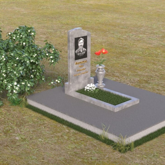 Геометрия модели продумана до мельчайших деталей. Начиная с основания, мы видим широкую плиту, обеспечивающую устойчивость всей конструкции. На ней возвышается горизонтальная плита меньшего размера, выполненная в зеркальной полировке, отражающая небо и окружающий мир, словно запечатлевая в себе мгновения жизни. Вертикальная стела, возвышающаяся над плитой, имеет сглаженные углы и плавные переходы, смягчающие строгость формы. Верхняя часть стелы, с ее деликатными сколами, придает ей уникальность и неповторимость. Рядом со стелой располагается небольшая ваза, выполненная в том же стиле, предназначенная для живых цветов, символизирующих вечную память и любовь.