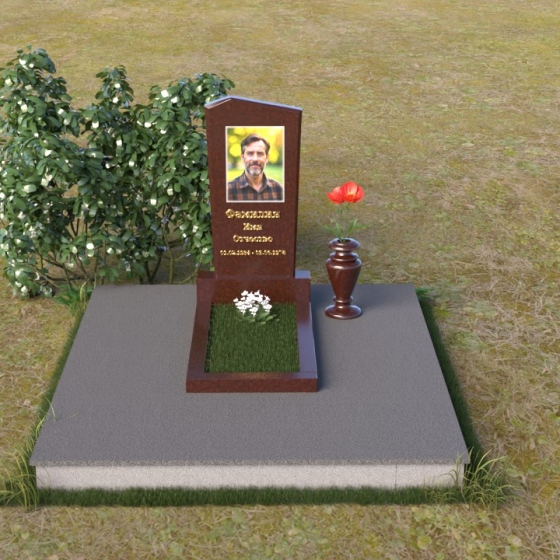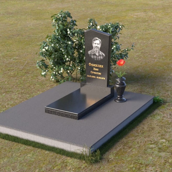 Этот гранитный монумент представляет собой композицию из двух основных элементов: вертикальной плиты с портретом и горизонтальной накладки. Вертикальная плита, возвышающаяся над землей, имеет строгую прямоугольную форму с небольшим скосом в верхней части. Это придает монументу сдержанную элегантность. Зеркальная полировка поверхности отражает свет, создавая ощущение глубины и сияния. На плите выгравирован портрет усопшего, выполненный с высокой точностью и вниманием к деталям. Ниже портрета располагается надпись с именем и датами жизни, выполненная золотым шрифтом. Горизонтальная накладка, расположенная в нижней части, также выполнена из черного полированного гранита и служит своеобразным пьедесталом для вертикальной плиты. Ее гладкая поверхность создает дополнительный контраст с окружающей средой. Рядом с монументом установлена ваза из черного гранита, предназначенная для живых цветов.