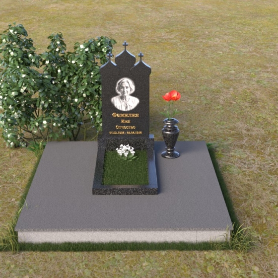 Форма надгробного сооружения представляет собой классический прямоугольник, увенчанный декоративным элементом в верхней части. Этот элемент, напоминающий силуэт православного храма, придает монументу особую духовность и возвышенность. Прямые линии и четкие грани символизируют стабильность и уверенность, а мягкие переходы и закругленные углы добавляют образу теплоты и человечности. Гладкая полированная поверхность отражает свет, создавая ощущение простора и легкости. На таком памятнике портрет усопшего будет выглядеть особенно выразительно и трогательно. Рекомендуем выбирать фотографии, отражающие светлые моменты жизни, наполненные радостью и любовью. Золотое начертание имени и дат жизни на фоне черного гранита создаст элегантный контраст и подчеркнет значимость каждой прожитой минуты.