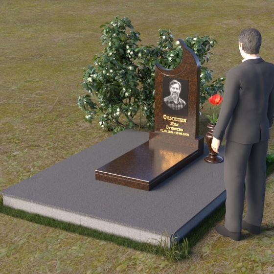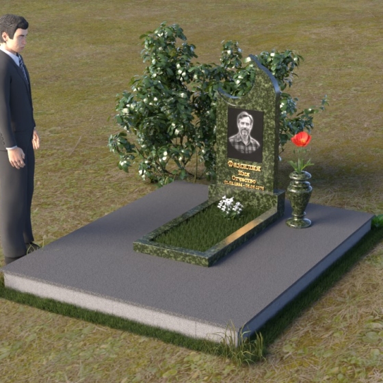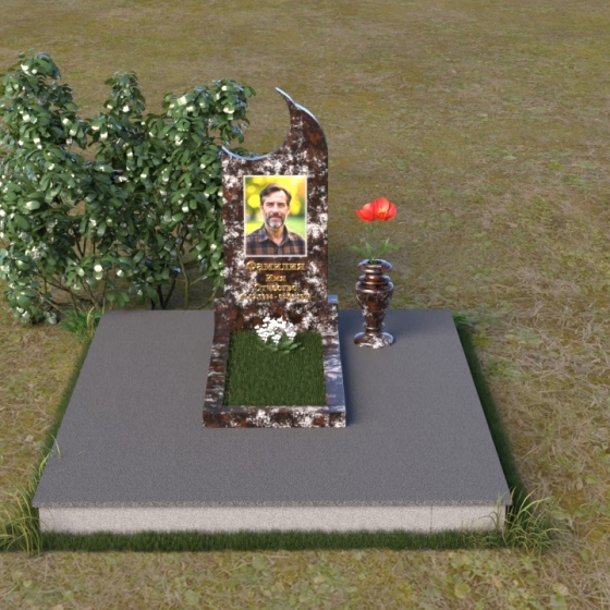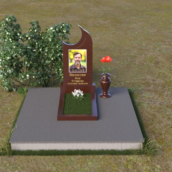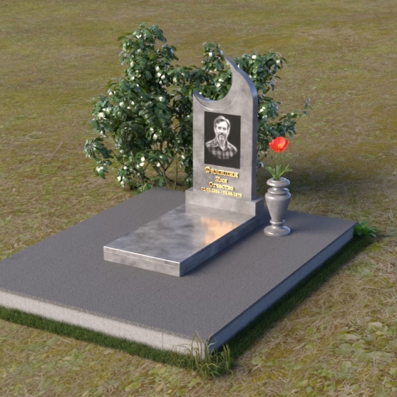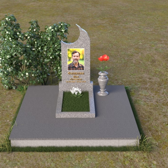 Этот гранитный монумент притягивает взгляд своей необычной формой. Основной элемент – вертикальная плита, увенчанная плавной, асимметричной дугой, напоминающей полумесяц. Её левая сторона чуть выше правой, что создает ощущение динамики и незавершенности, словно оборвавшейся жизни. Поверхность лицевой стороны отполирована до зеркального блеска, отражая небо и окружающий пейзаж, создавая иллюзию глубины и пространства. На полированной поверхности выгравирован портрет усопшего, надпись с именем и датами жизни. Нижняя часть монумента, сопрягаясь с горизонтальной плитой, образует единый ансамбль. Переход между вертикальной и горизонтальной плоскостями подчеркнут небольшой ступенькой, добавляющей конструкции объема. Горизонтальная плита, в свою очередь, также отполирована до блеска, отражая свет и усиливая эффект монументальности. Фаски на гранях плиты аккуратно обработаны, что придает памятнику завершенный и элегантный вид. Сбоку от монумента расположена небольшая гранитная ваза, предназначенная для живых цветов, которые станут символом вечной памяти и любви.